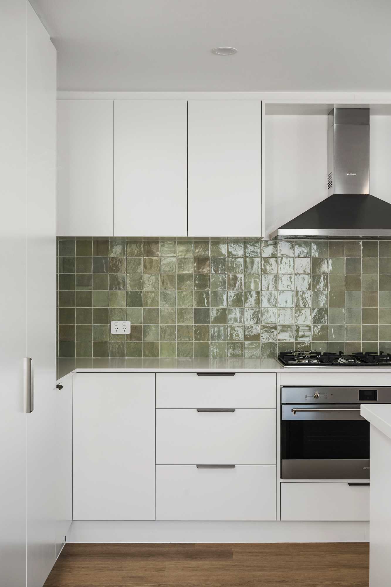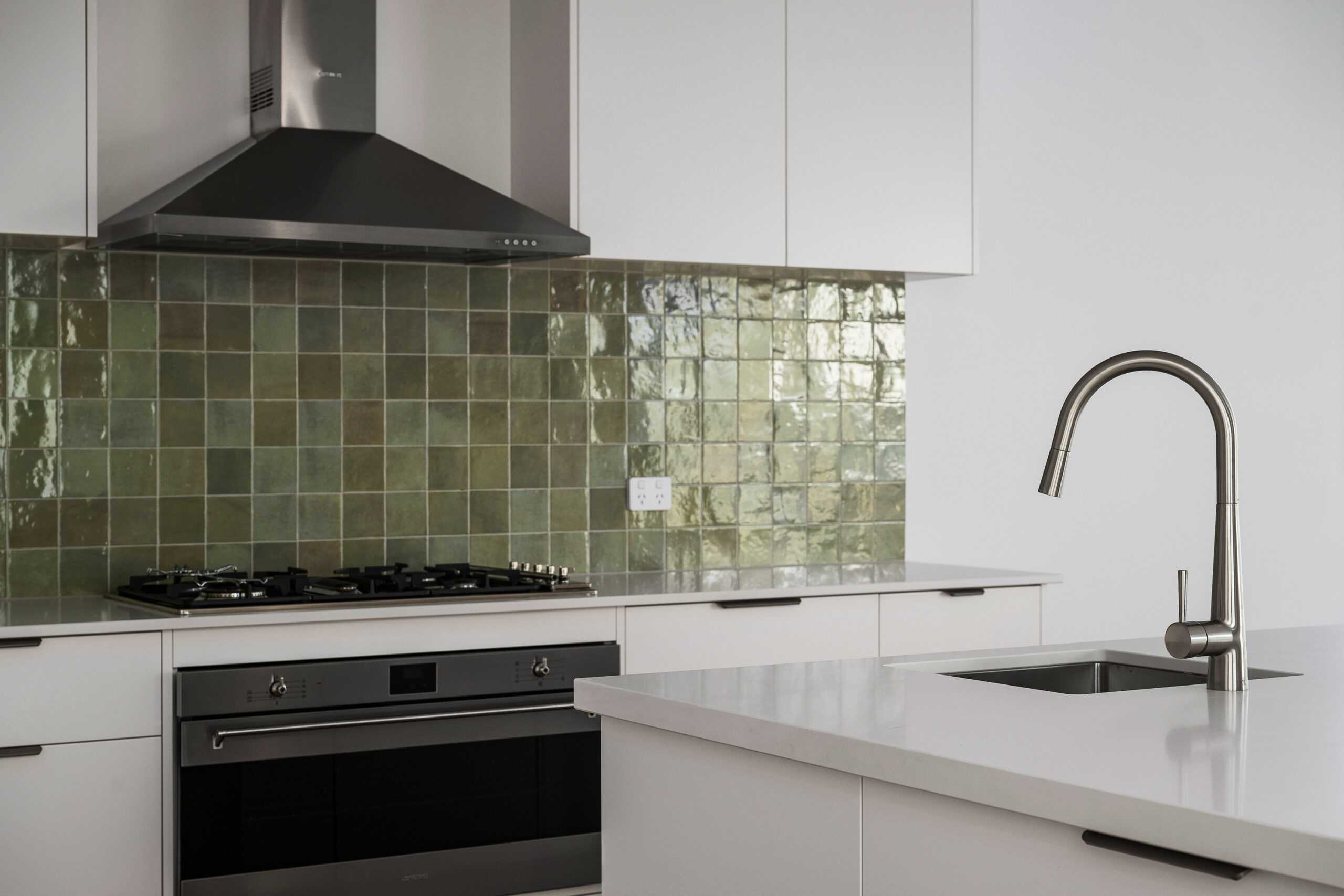 Splash Back Tiles – Zellige Salvia Gloss 100×100 w/ Misty Grey Grout