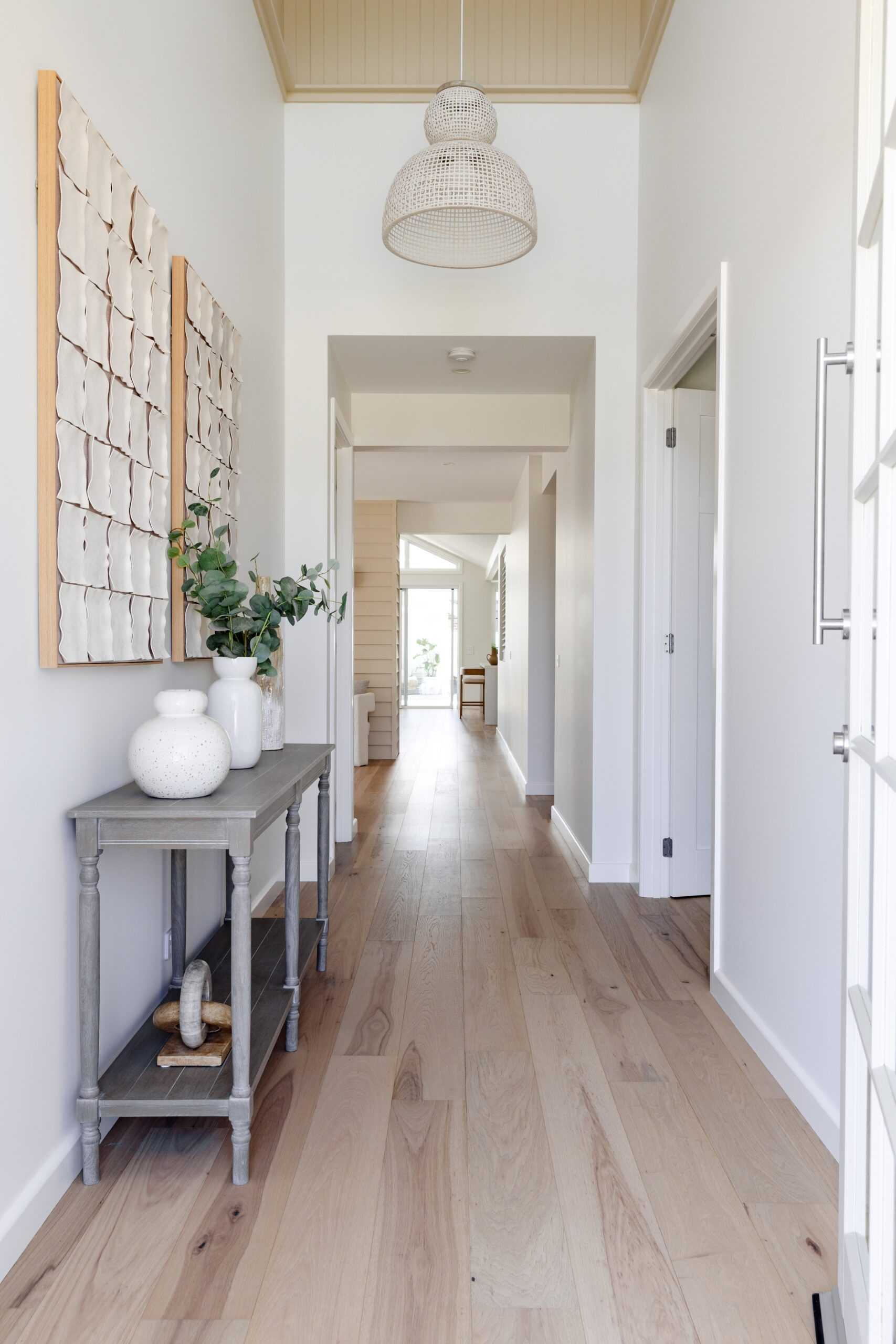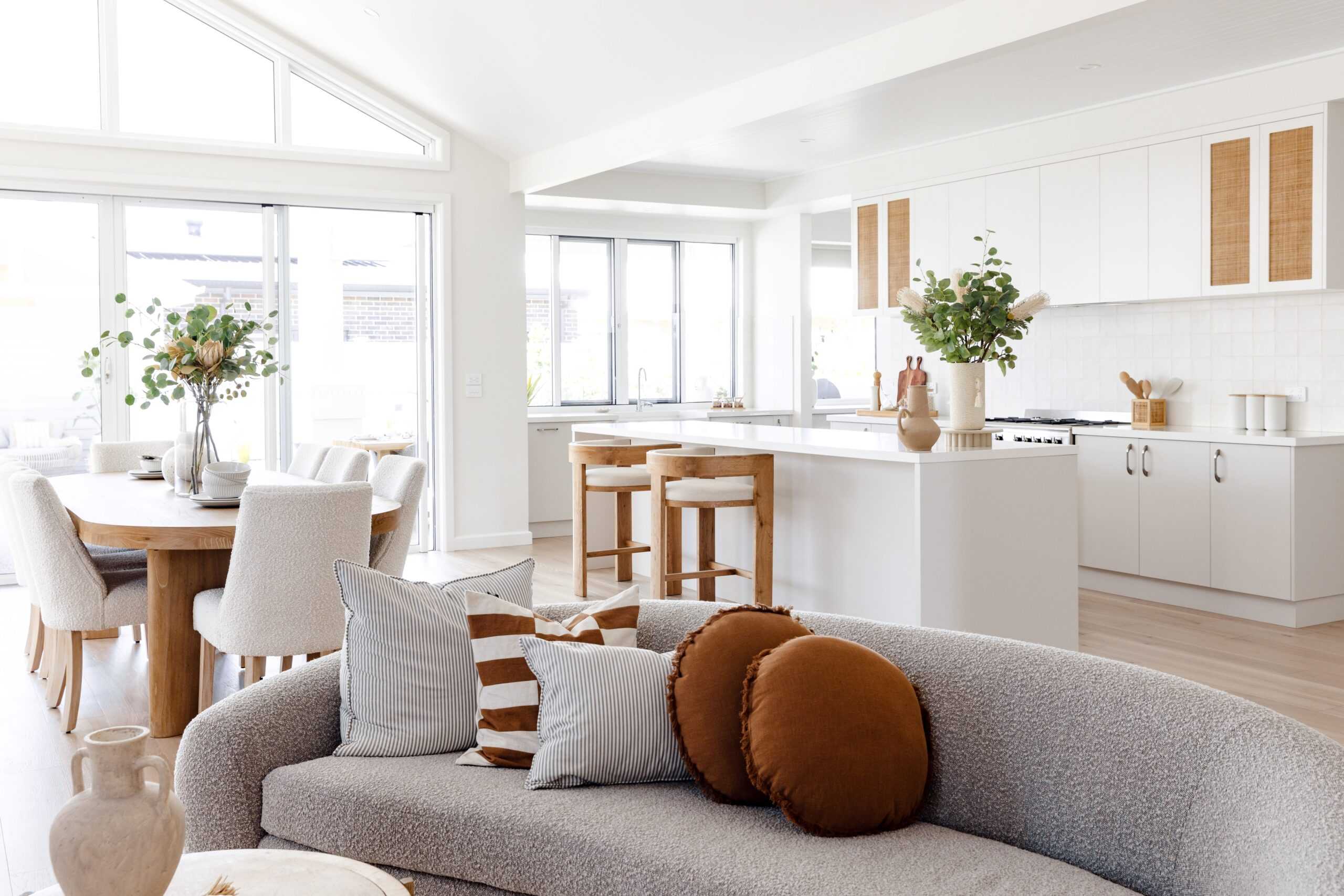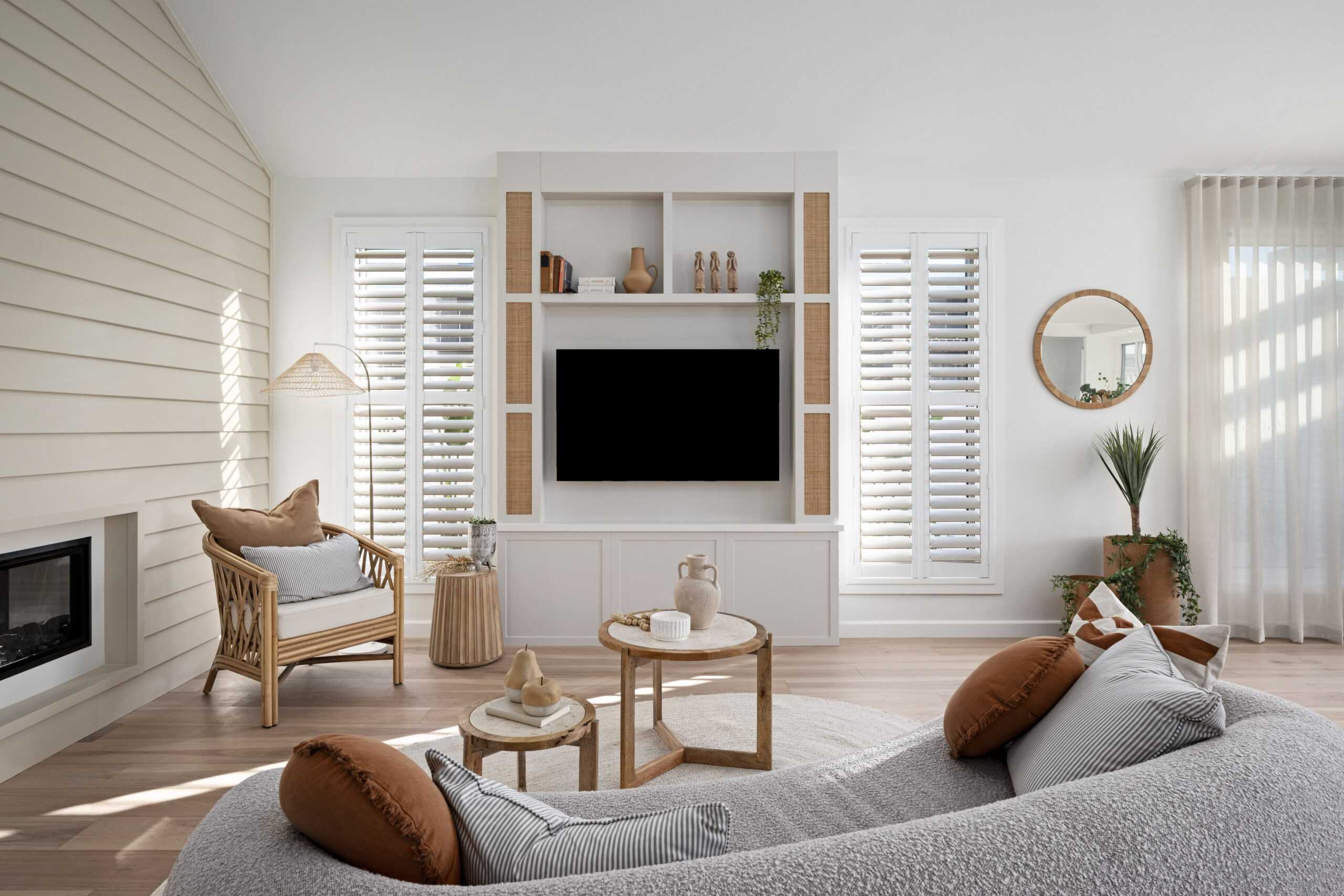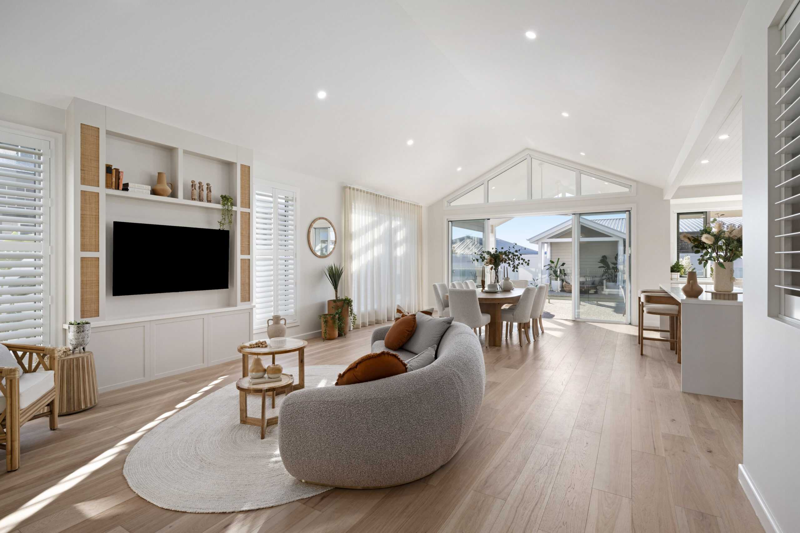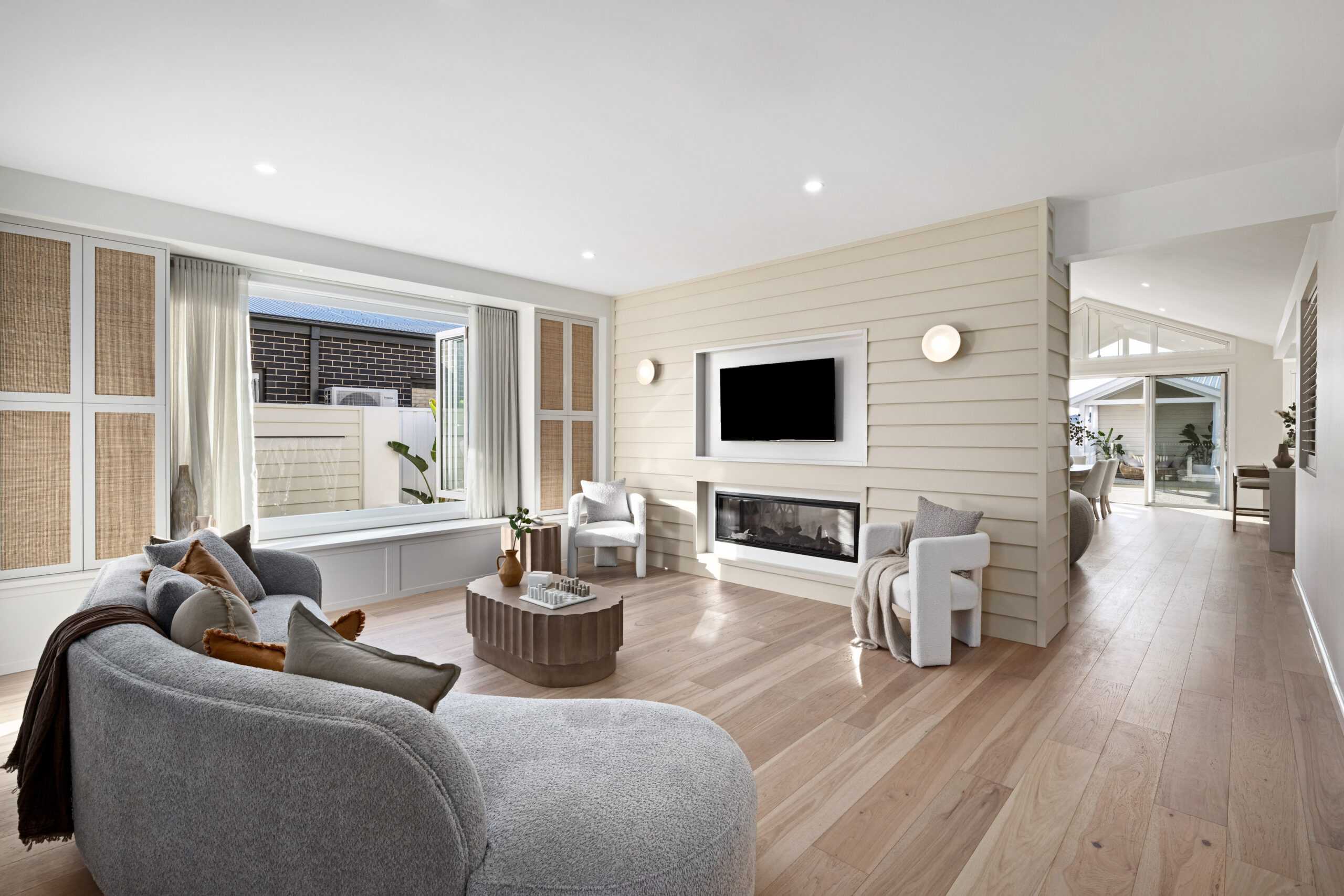 The main living area embraces relaxed coastal style, featuring decorative linea cladding, woven cabinetry details and soft window furnishings that enhance the natural light.