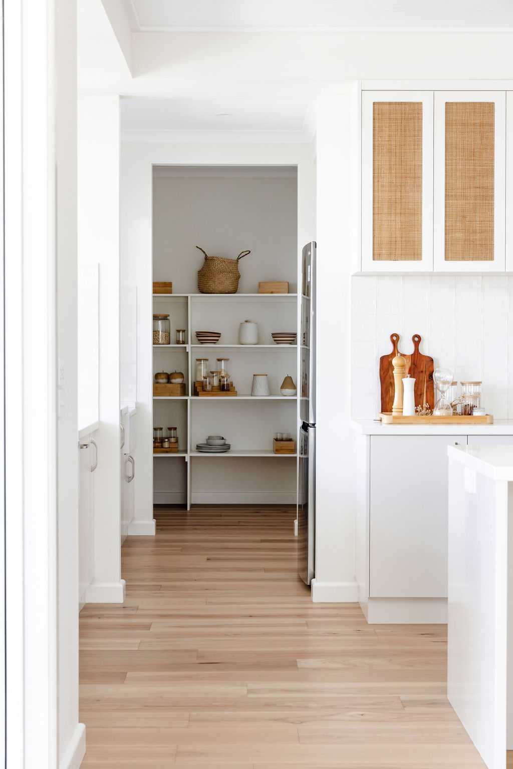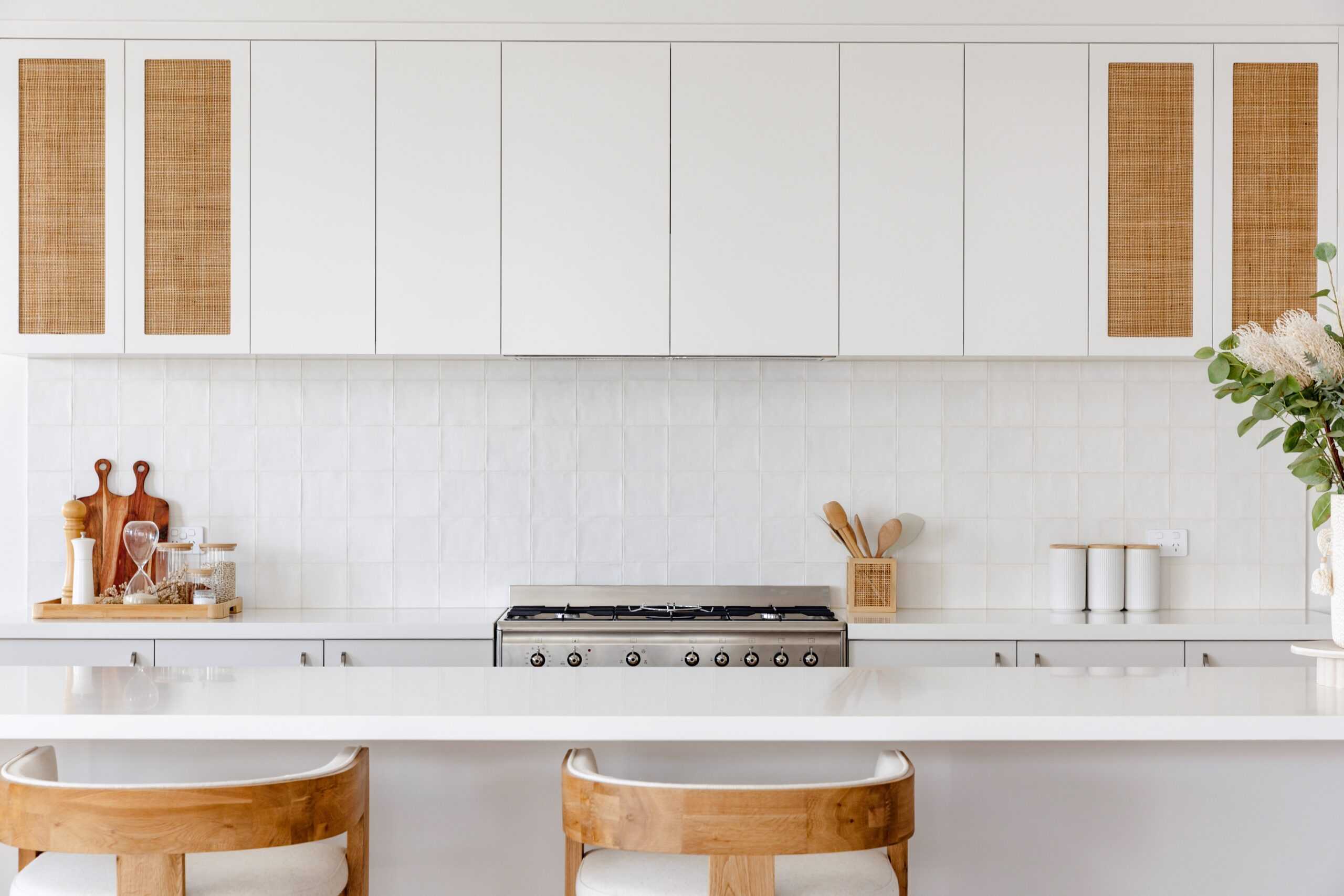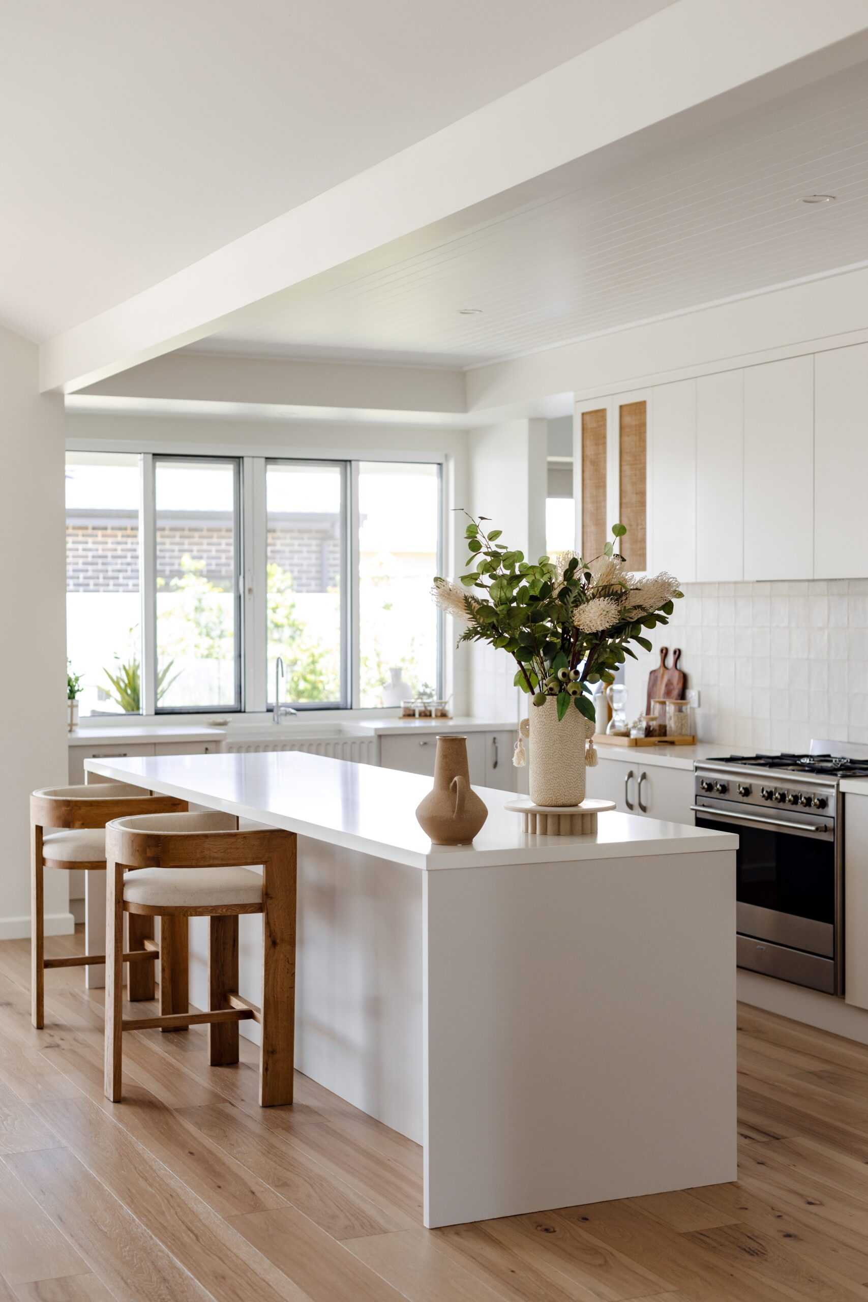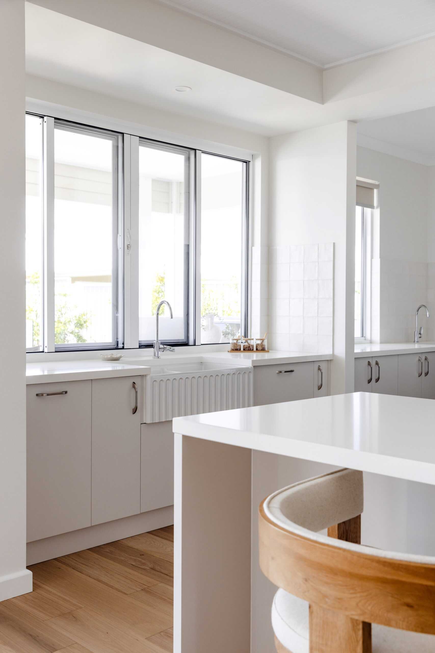 At the heart of the home, the kitchen is serene and light-filled. White cabinetry, stone benchtops and a classic farmhouse sink set the tone, while wicker and rattan details introduce warmth and texture. A fully equipped butler’s pantry keeps the space streamlined, and a servery window connects directly to the outdoor kitchen — making entertaining seamless.
