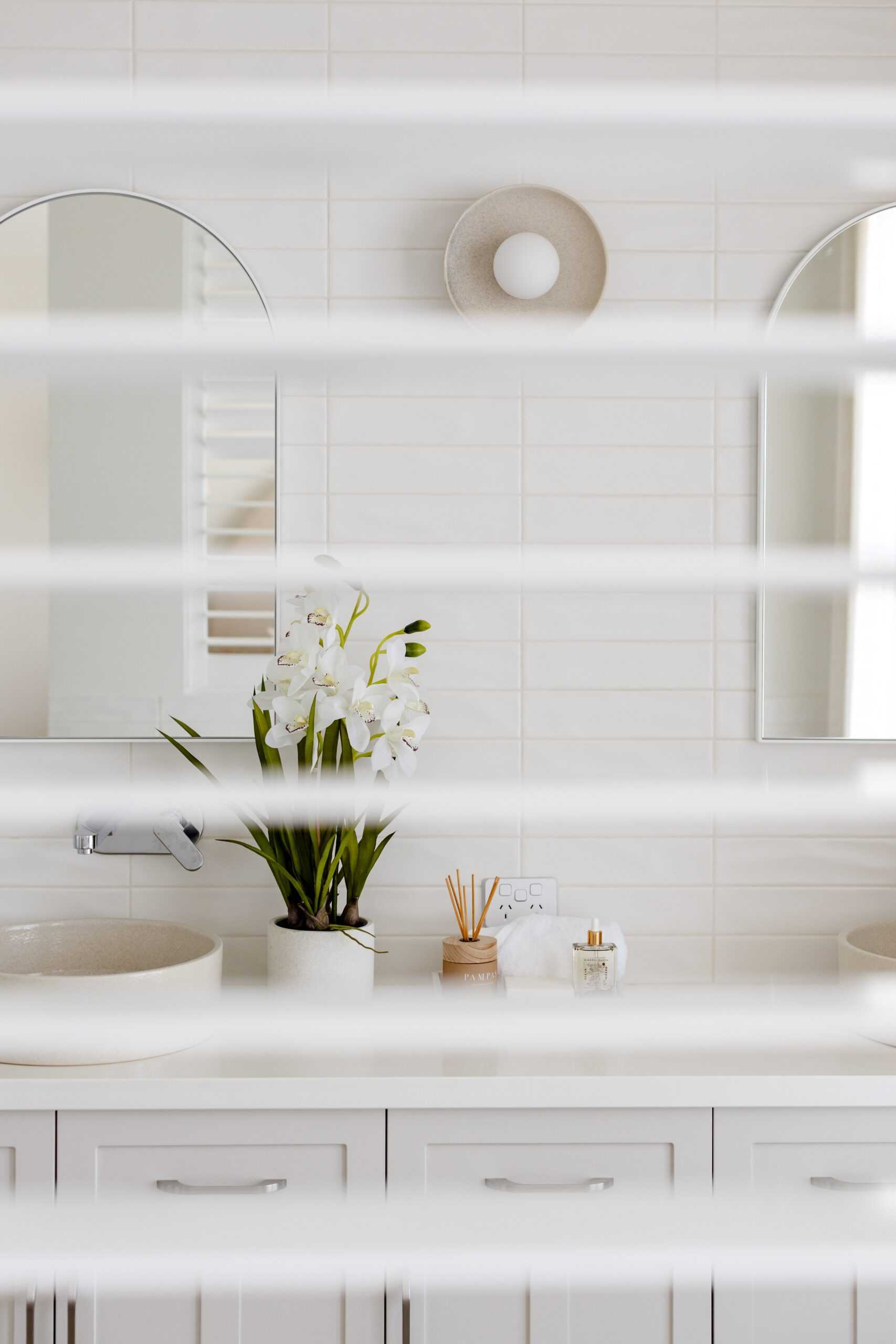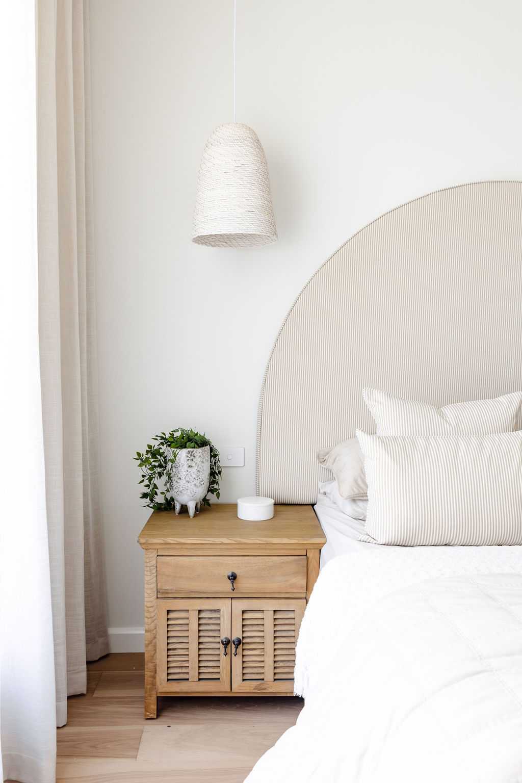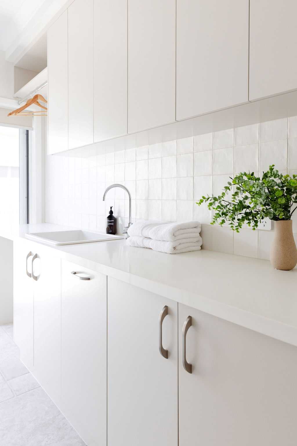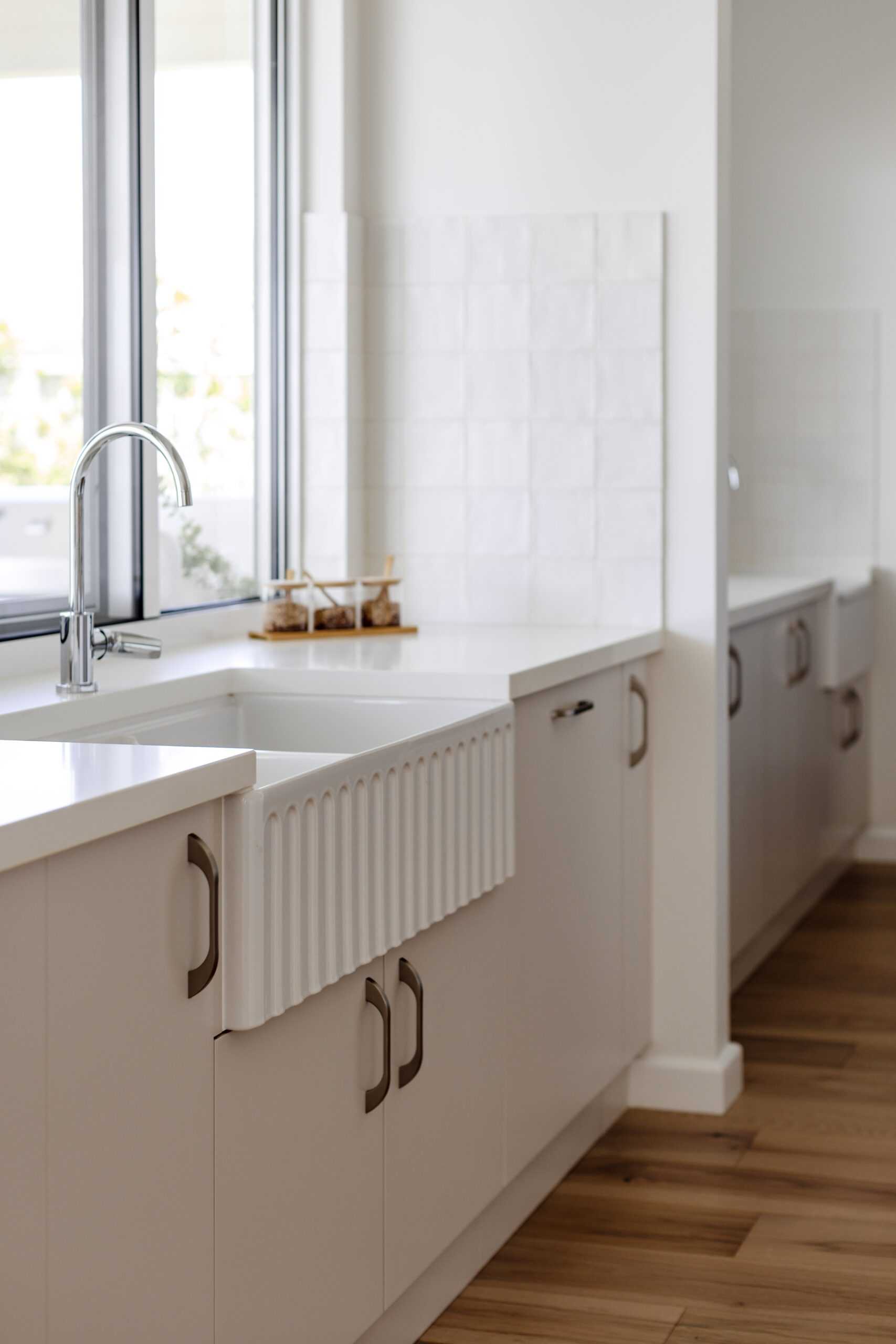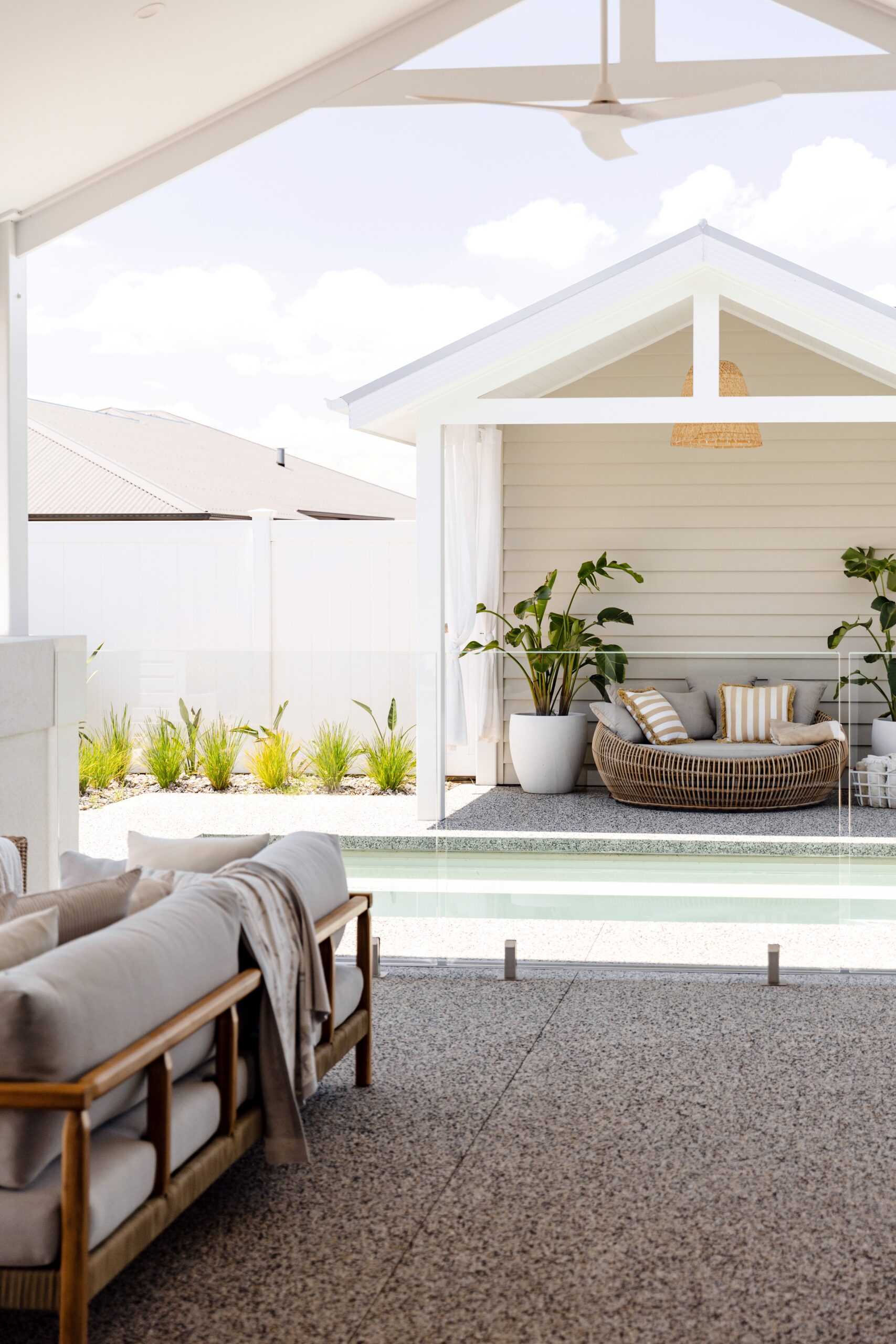 At the heart of the home, the kitchen is serene and light-filled. White cabinetry, stone benchtops and a classic farmhouse sink set the tone, while wicker and rattan details introduce warmth and texture. A fully equipped butler’s pantry keeps the space streamlined, and a servery window connects directly to the outdoor kitchen — making entertaining seamless.